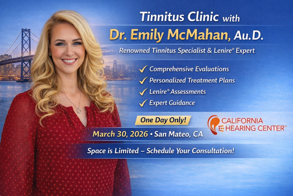 California Hearing Center is thrilled to welcome Dr. Emily McMahan, Au.D. for a one-day, in-person tinnitus clinic on Monday, March 30, 2026 at our San Mateo location. Through our ongoing partnership, Bay Area patients can access Dr. McMahan’s advanced tinnitus protocols locally—without traveling out of state.